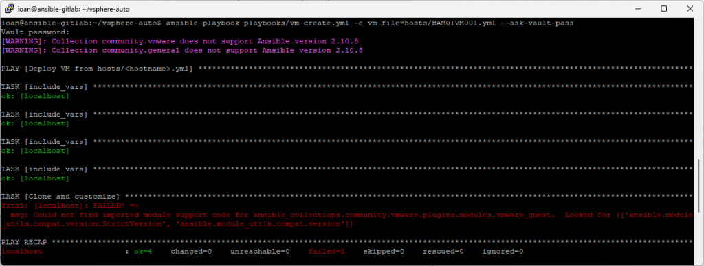 expect a newer Ansible core (Ansible 8/9 era). - Result: the collection can’t import required utils from the old Ansible → the playbook stops.