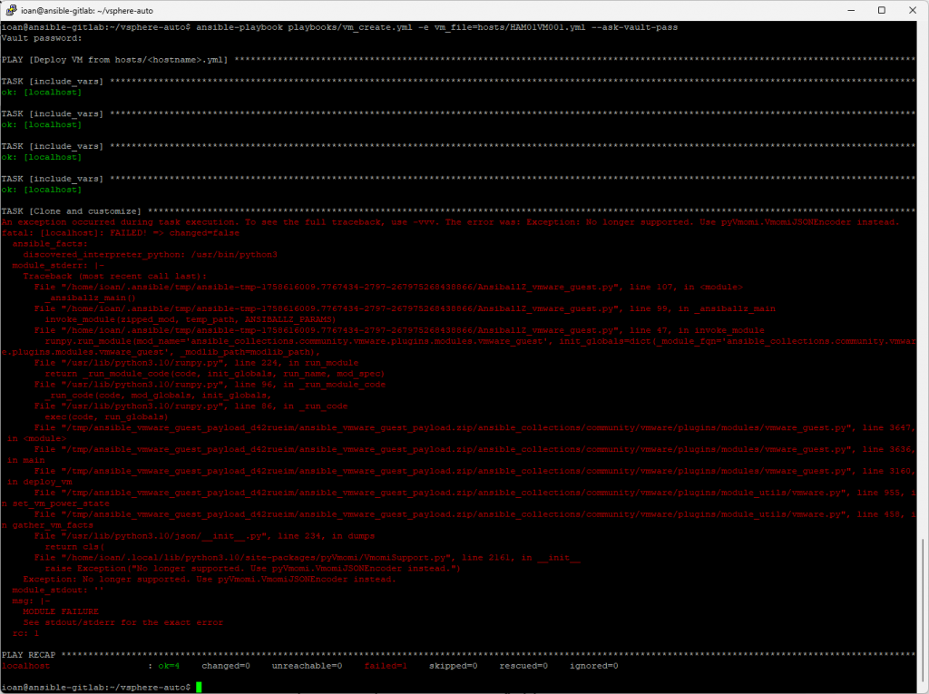 In this part of the series, we built the foundation for automating VM deployments on vSphere with Ansible. We prepared the lab, installed Ansible, connected it to vCenter, and successfully deployed our first virtual machine from a template. Along the way, we also solved a common compatibility issue between pyVmomi