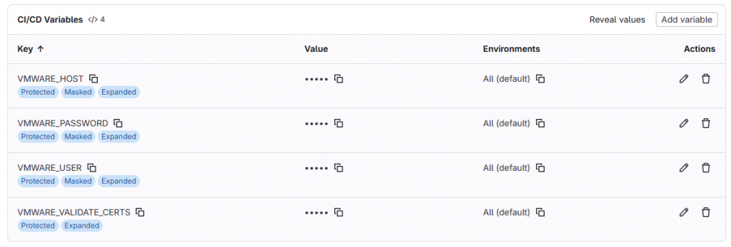- CI/CD jobs stay simple: Ansible will read vCenter connection info directly from environment variables.