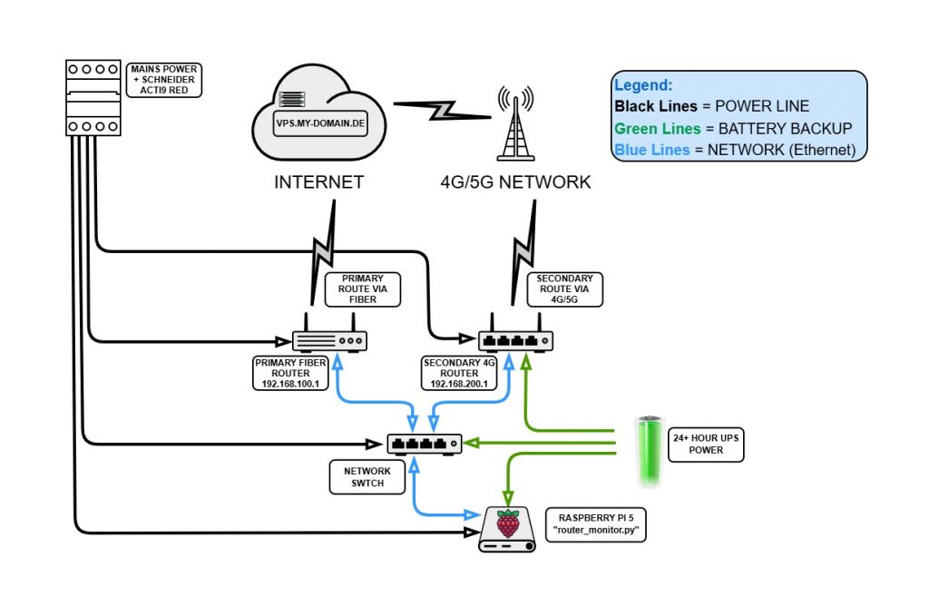 This allows the Pi to stay in constant contact with both gateways. I wrote a custom Python watchdog to handle the “decision making.” It differentiates between a router failure and an ISP failure: